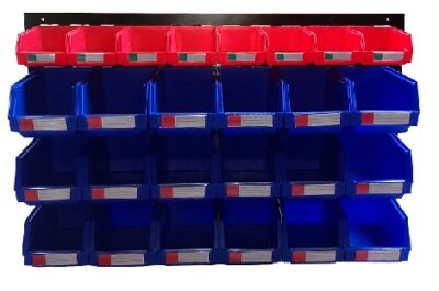 Organizador de pared fabricado en acero y con ranuras para 26 cajas colgables. Ideal para estaciones de trabajo, manteniendo el orden y organización.